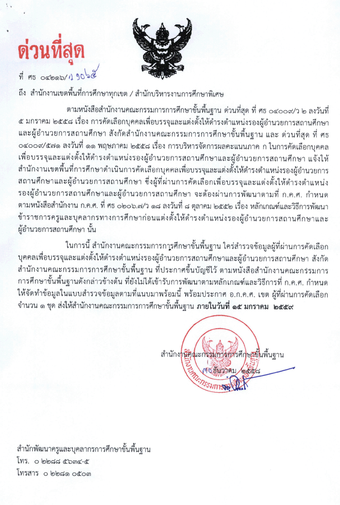 สพฐ.มีหนังสือ แจ้งสำรวจข้อมูลผู้ที่ผ่านการคัดเลือกบุคคลเพื่อบรรจุและแต่งตั้งให้ดำรง ตำแหน่งรองผู้อำนวยการสถานศึกษาและผู้อำนวยการสถานศึกษา ที่ยังไม่ผ่านการพัฒนาตามที่ ก.ค.ศ. กำหนด
