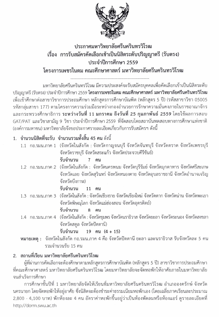 ประกาศรับสมัครคัดเลือกเข้าเป็นนิสิตระดับปริญญาตรี (รับตรง) ประจำปีการศึกษา 2559 มหาวิทยาลัยศรีนครินทรวิโรฒ จะรับสมัครสอบคัดเลือก ระดับปริญญาตรี ปีการศึกษา 2559 ระหว่างวันที่ 11 มกราคม - 25 กุมภาพันธ์ 2559 โดยใช้ผลการสอบ GAT/PAT และวิชาสามัญ 9 วิชา ประจำปีการศึกษา 2559 ที่จัดสอบโดยสถาบันทดสอบทางการศึกษาแห่งชาติ (องค์การมหาชน)