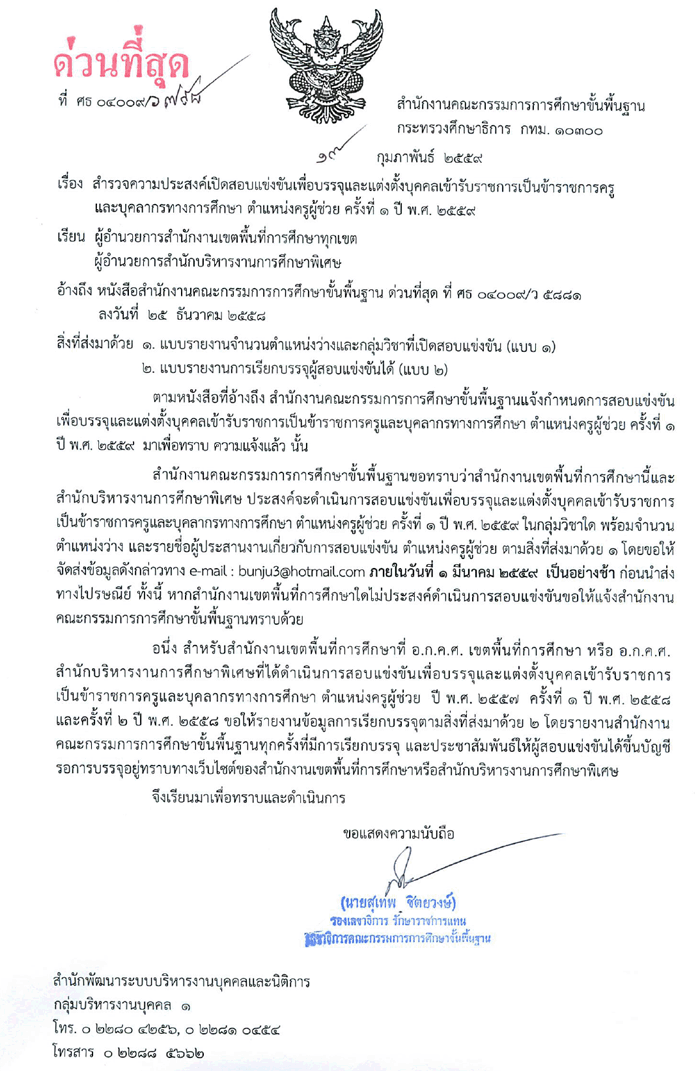 สำนักงานคณะกรรมการการศึกษาขั้นพื้นฐาน มีหนังสือ ด่วนที่สุด ที่ ศธ 04009/ว 798 เรื่อง สำรวจความประสงค์เปิดสอบแข่งขันเพื่อบรรจุและแต่งตั้งเป็นข้าราชการครูและ บุคลากรทางการศึกษา ตำแหน่งครูผู้ช่วย ครั้งที่ 1 ปี พ.ศ.2559