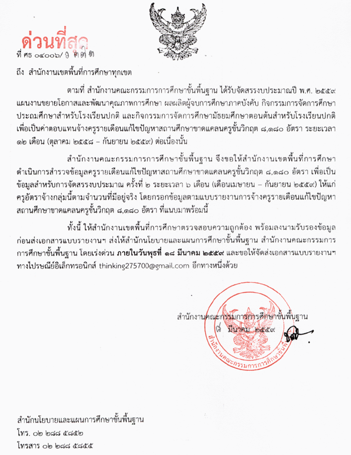 สำนักงานคณะกรรมการการศึกษาขั้นพื้นฐาน แจ้งให้สำนักงานเขตพื้นที่การศึกษา ดำเนินการสำรวจข้อมูลครูรายเดือนแก้ไขปัญหาสถานศึกษาขาดแคลนครูขั้นวิกฤต 8,180 อัตรา