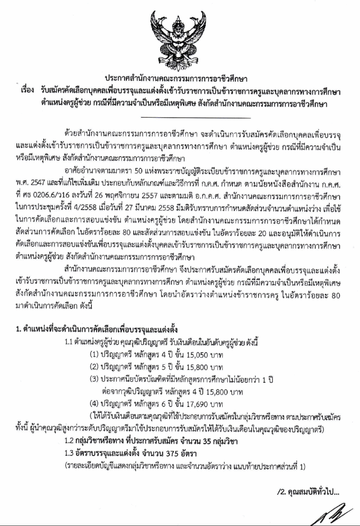 ด่วน! สอศ.เปิดรับสมัครสอบคัดเลือก ครูผู้ช่วย กรณีมีความจำเป็นหรือมีเหตุพิเศษสมัครด้วนตนเอง ที่หน่วยรับสมัครประจำจังหวัด วันที่ 10-17 สิงหาคม 2558