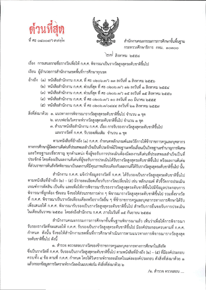 การเสนอรายชื่อรางวัลเพื่อให้ ก.ค.ศ.พิจารณาเป็นรางวัลสูงสุดระดับชาติขึ้นไป
