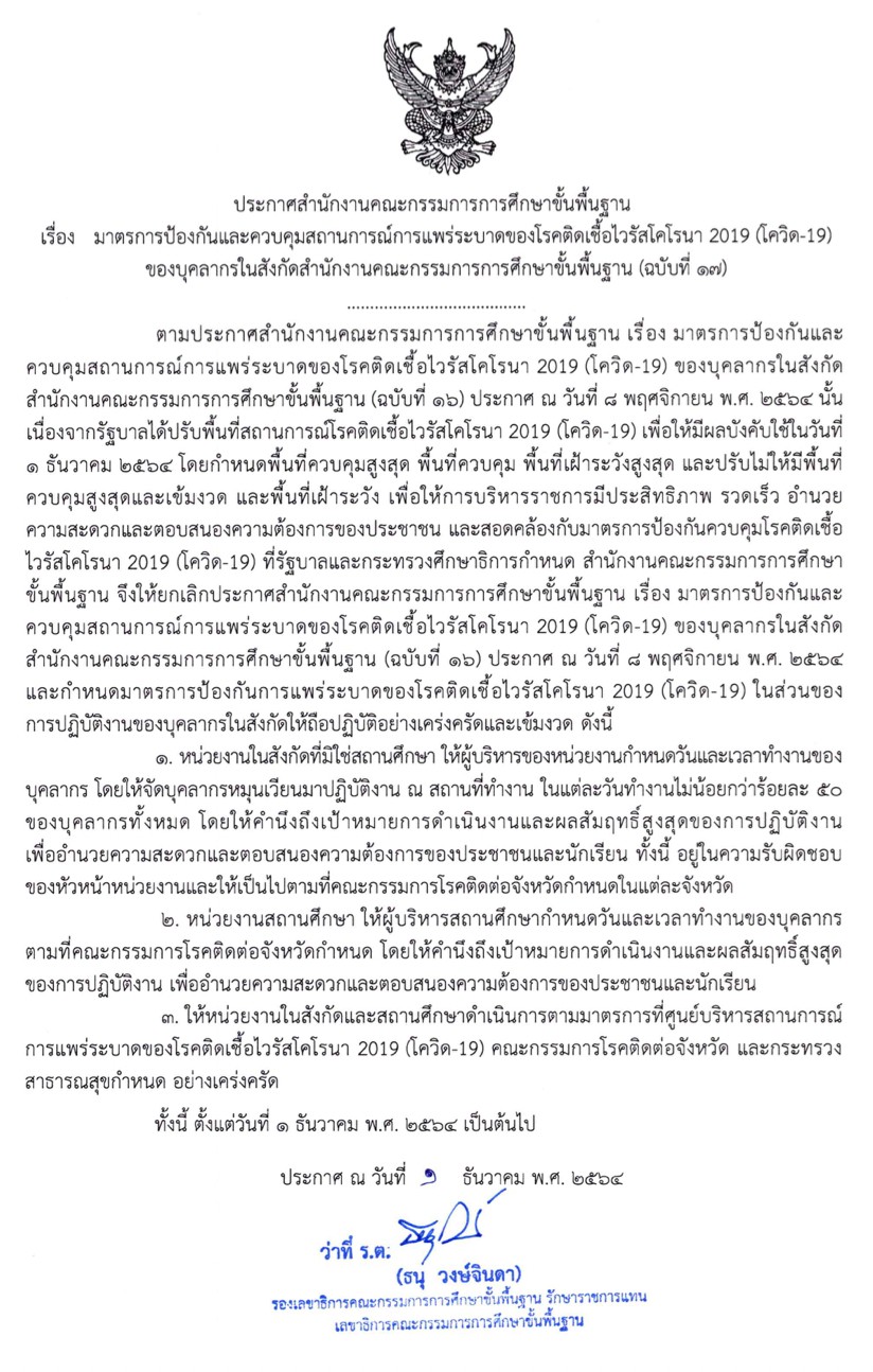 มาตรการป้องกันและควบคุมสถานการณ์การแพร่ระบาดของโรคติดเชื้อไวรัสโคโรนา 2019 (โควิด-19) ของบุคลากรในสังกัด สพฐ. (ฉบับที่ 17)