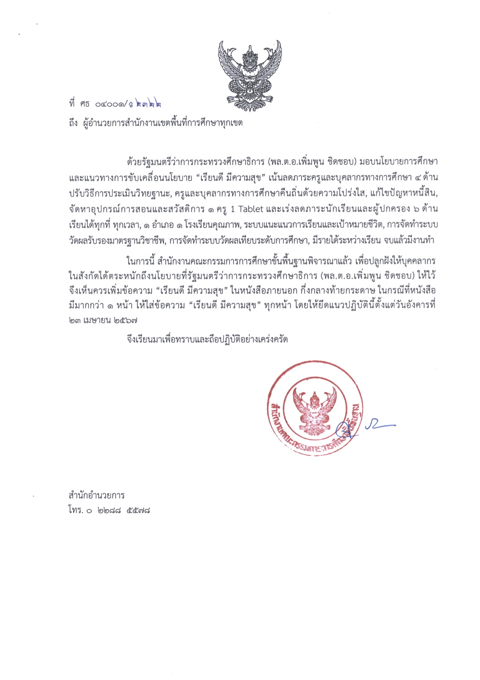 ในการนี้ สำนักงานคณะกรรมการการศึกษาขั้นพื้นฐาน พิจารณาแล้วเพื่อปลูกฝังให้บุคคลากรในสังกัดได้ตระหนักถึงนโยบายที่รัฐมนตรีว่าการกระทรวงศึกษาธิการ (พล.ต.อ.เพิ่มพูน ชิดชอบ) ให้ไว้ จึงเห็นควรเพิ่มข้อความ "เรียนดี มีความสุข" ในหนังสือภายนอก กึ่งกลางท้ายกระดาษ ในกรณีที่หนังสือ มีมากกว่า 1 หน้า ให้ใส่ข้อความ "เรียนดี มีความสุข" ทุกหน้า โดยให้ยึดแนวปฏิบัตินี้ ตั้งแต่วันอังคารที่ 23 เมษายน 2567 จึงเรียนมาเพื่อทราบและถือปฏิบัติอย่างเคร่งครัด