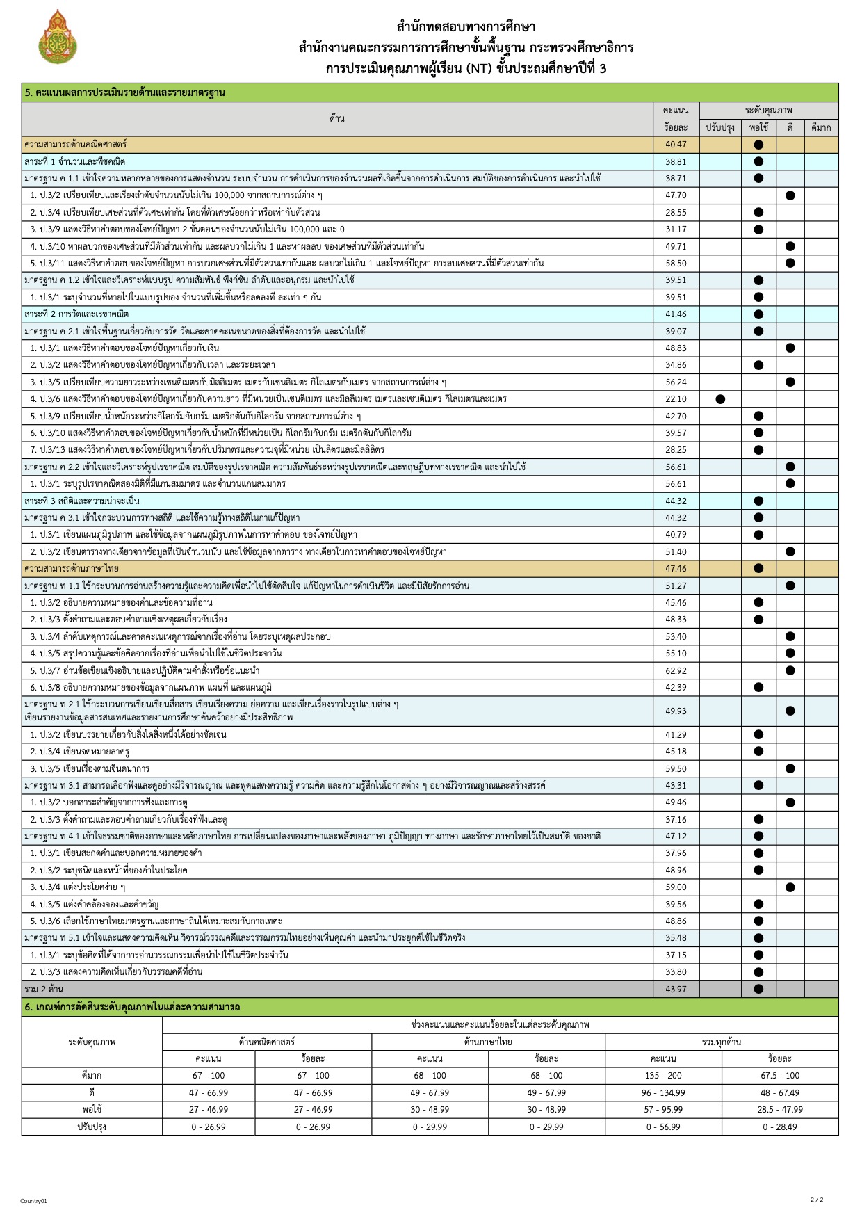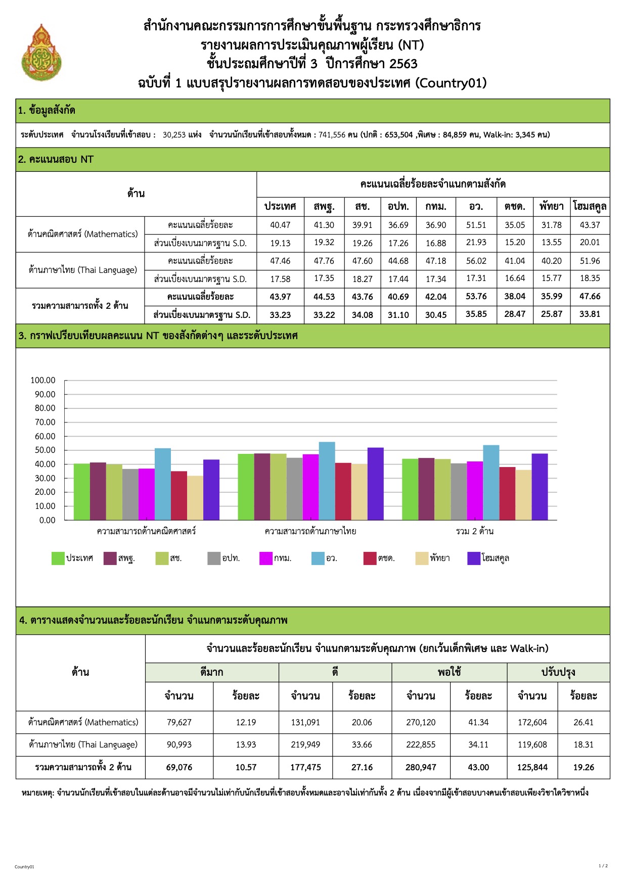 สำนักงานคณะกรรมการการศึกษาขั้นพื้นฐาน ได้ประกาศผลการประเมินคุณภาพผู้เรียน (NT) ชั้นประถมศึกษาปีที่ 3 ปีการศึกษา 2563