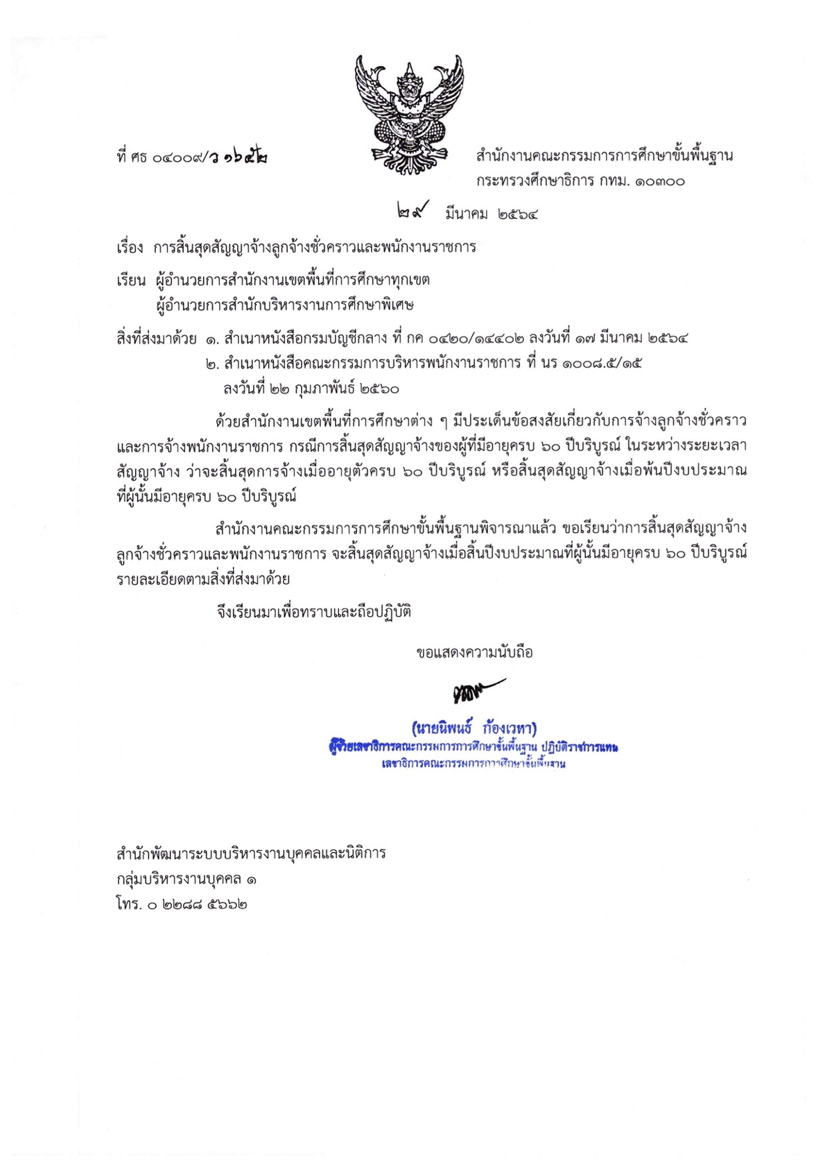 ที่ ศธ 04009/ว 1652 ลว 29 มีนาคม 2564 เรื่อง การสิ้นสุดสัญญาจ้างลูกจ้างชั่วคราวและพนักงานราชการ