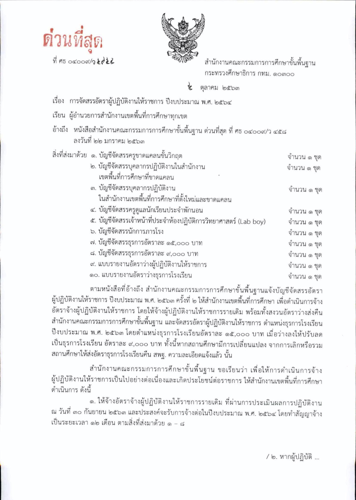 ด่วนที่สุด ที่ ศธ 04009/ว 5954 การจัดสรรอัตราผู้ปฏิบัติการงานให้ราชการ ปีงบประมาณ พ.ศ. 2564
