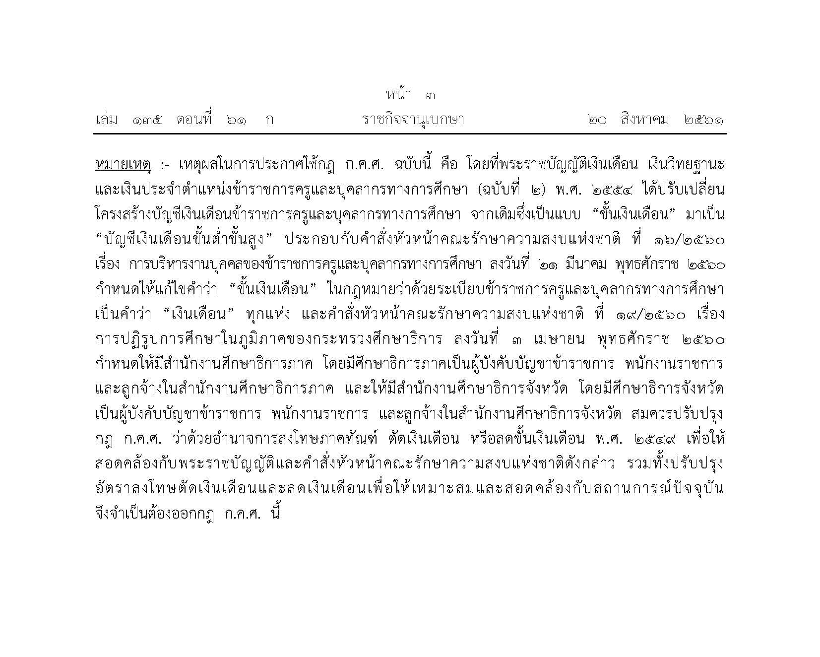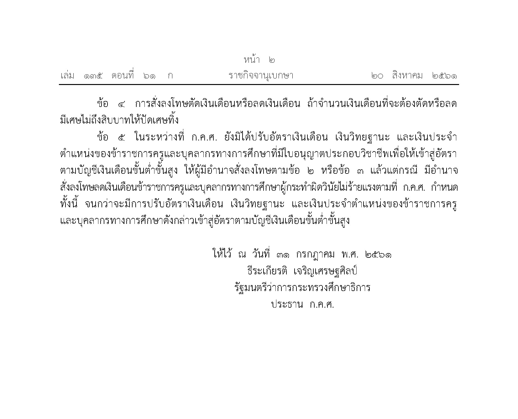 เมื่อวันที่ 20 สิงหาคม 2561 เว็บไซต์ราชกิจจานุเบกษา ได้เผยแพร่กฎ ก.ค.ศ. ว่าด้วยอำนาจการลงโทษภาคทัณฑ์ ตัดเงินเดือน หรือลดเงินเดือน พ.ศ.2561 โดยมีรายละเอียด ดังนี้