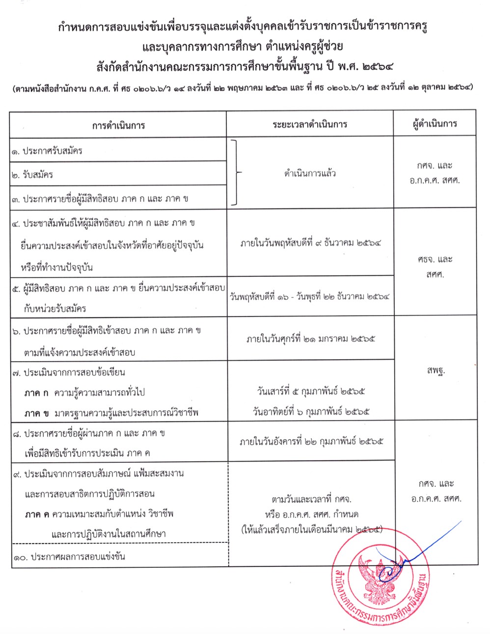 กำหนดการสอบและตารางสอบบรรจุ ครูผู้ช่วย สังกัด สพฐ. ปี พ.ศ.2564