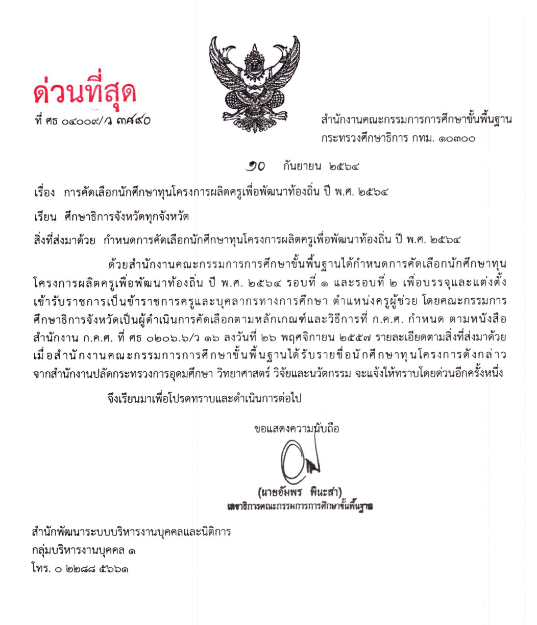ด่วนที่สุด เรื่องการคัดเลือกนักศึกษาทุนโครงการผลิตครูเพื่อพัฒนาท้องถิ่น ปี พ.ศ. 2564